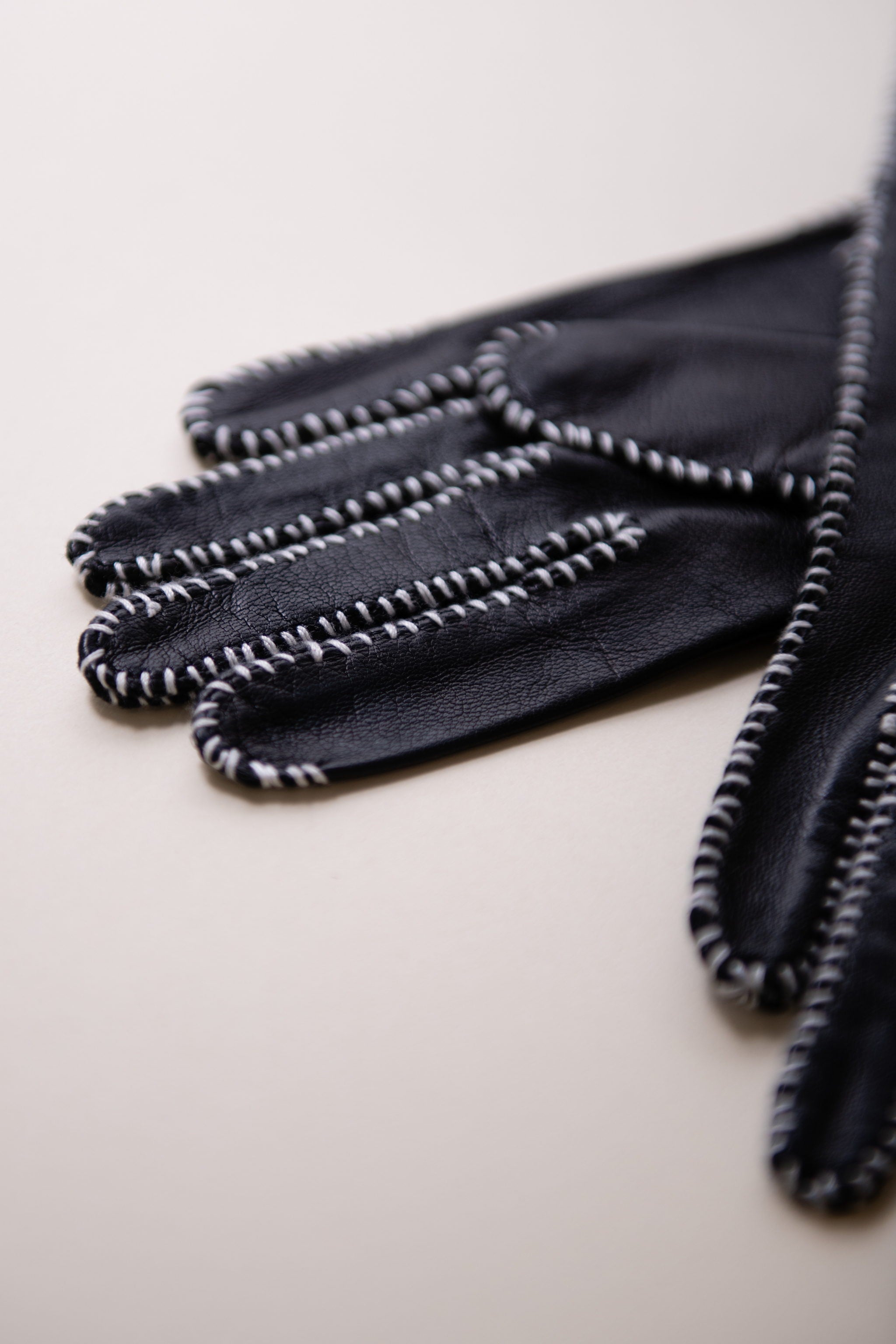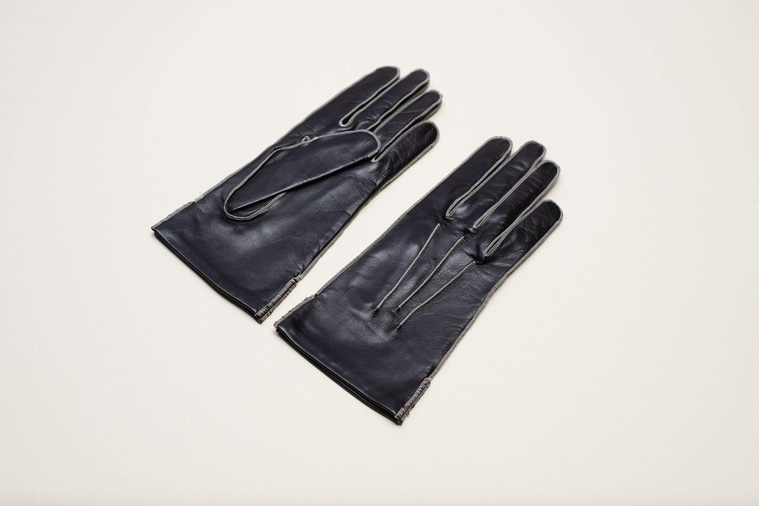 Leather gloves with contrasting whip-stitch detail. Available in both feminine and masculine sizing.